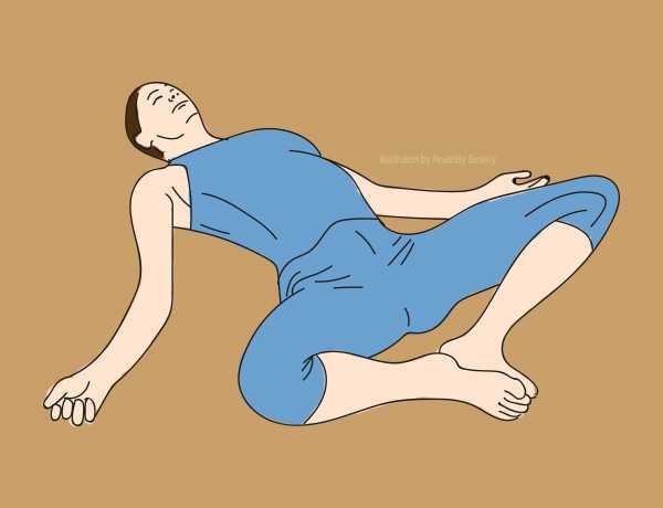 Ляг на спину, широко расставь руки в стороны. Прижми правое колено к груди. Затем поверни всё туловище влево, спину при этом оставь ровной. Побудь в этой позиции примерно 3 минуты, повтори с другой стороной. Эта поза очень полезна всем, у кого часто болит спина в области копчика.