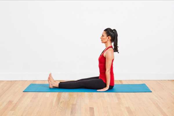 - Сесть на поверхность, выпрямив вперед ноги и выровняв спину.