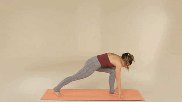 Вот как: Примите асану смотрящев вниз собаки: с опорой на расставленные руки и ноги, копчик вверх, лицо – вниз. На выдох перенесите вес тела на левую руку и левую ногу, а правой ногой шагните назад, подняв руку над головой, и поднимите тело в боковой поддержке. На вдохе приподнимите выше бедра, и с выдохом сделайте шаг левой ногой и растяните правую руку. Поднимите бедра выше с каждым вдохом.