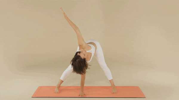 Вот как: Из основной стойки сделайте широкий шаг вперед, подняв руки через стороны к потолку. Поверните туловище вправо и при выдохе руки разведите в стороны. Опорная нога согнута в колене под прямым углом.