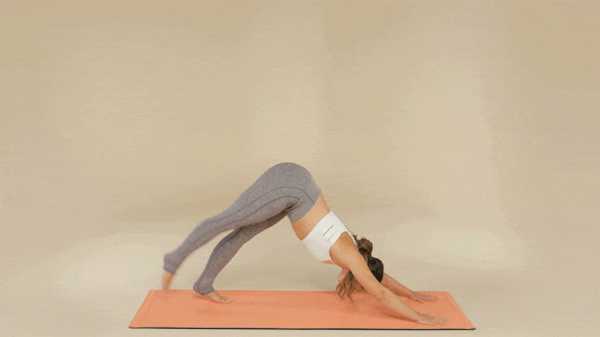 Вот как: Примите позу собаки: на четвереньках, головой вниз, ноги и руки прямые, пальцы врозь. При вдыхании выпрямите правую ногу вертикально вверх, не сгибая ноги. Упритесь руками, растягивая заднюю поверхность бедра. Голова остается на одной прямой линии со спиной.