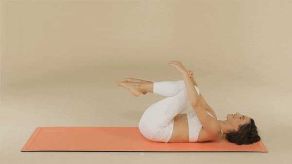 Ляг на спину, согни ноги в коленях, лодыжки скрести. Обними руками колени и крепко держи их. Почувствуй, как тянутся мышцы бедер и спины.