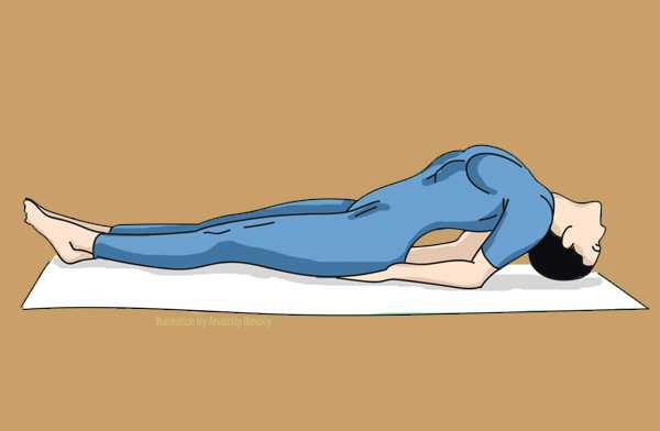 - Лоб касается поверхности, верхние конечности вытянуть вдоль корпуса, ладонями кверху.