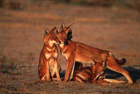 Красный волк – редкий вид, включенный в Красную книгу МСОП и Красную книгу РФ. На территории России находится под угрозой исчезновения. В Индии разрешается охота, но только по лицензиям. Внешне это животное имеет своеобразный вид – смешаны черты серого волка, лисы и шакала. Длина тела 76-103 см, хвоста – 40-48 см, вес – 14-21 кг. У красного волка густая длинная рыже-красная шерсть на спине и боках, на груди, животе и внутренней стороны ног – кремового цвета. Длинный пушистый хвост похож на лисий, он темнее остальных частей тела, почти черный на конце. На голове видно темный узор вокруг глаз и на носу. Красный волк – хищник, питается в основном дикими животными, но летом употребляет также растительную пищу, а именно, горный ревень. В логовах со щенками всегда находится это растение. Считается, что волки кормят ими маленьких волчат, отрыгивая полупереваренные соцветия ревеня. Иногда поедают падаль. Охотятся волки стаями в 15-20 особей, действуют очень слаженно, что позволяет им поймать даже крупного е животное, например, буйвола. Благодаря своей выносливости они загоняют свою добычу до изнеможения, после чего участь ее решена. Красные волки довольно «разговорчивые» животные. Бодрствующие животные почти постоянно издают тихое поскуливание, видимо, поддерживая связь с другими членами стаи. В Индии красные колки размножаются в течении полугода. Продолжительность беременности самок 60-68 дней. Средний размер выводков 4-6 щенков. Волчата имеют темно-коричневую окраску, слепые, весом 200-350 г. Покидают нору щенки в 70-80 дней, в семь месяцев уже участвуют в коллективной охоте. Половозрелость наступает в 2-3 года. Длительность жизни в неволе около 16 лет. В неволе этот срок гораздо меньше.