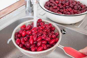 - Начинайте процедуру с сортировки и ополаскивания кизила. По желанию можете освободить плоды от косточек, надавив на центр дном стакана. Затем сложите все ягоды в дуршлаг и подержите над паром 5 минут.