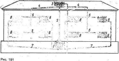 In the basement of the building installed boiler 1 (rice. 191), it heats the water. From the top of the boiler main pipe 2 It goes to the attic, where it connects to the expansion vessel 3. Expansion is called because, that it receives the excess water volume, formed by heating it from expanding. From the expansion tank on the attic conduct system of distribution pipes 4, which extend down from the vertical tubes 5, passing through the building room. From these pipes water flows into the radiators used, made up of cast iron pipes and installed usually under windows.