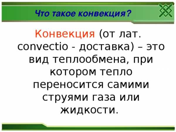 Конвекция (от лат. convectio — доставка) – это вид теплообмена, при котором тепло переносится самими струями газа или жидкости.