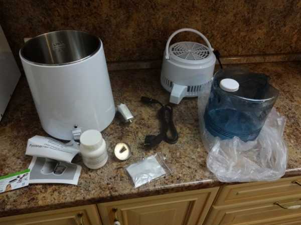 Это такое «ведро» из нержавейки со встроенным снизу нагревателем. Накрывается же оно охладителем через который проведена трубка. Вода кипит в течении 3,5 часов выходя паром в охладитель и преобразовываясь обратно в воду скапливается в 4-литровую ёмкость. Потерь практически нет, что очень эффективно. Дополнительные затраты электроэнергии дают 1 Квт/1,3 литра (по инструкции). Разница оплаты за январь месяц у меня составила сумму эквивалентную цене одной бутылки водки. Благо — не пью, поэтому не жалко :). Смотря на жизнь в целом, экономить на здоровье — глупо.