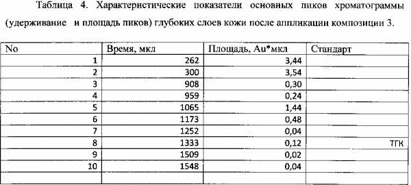 — в Таблице 4 — Характеристические показатели основных пиков хроматограммы (удерживание и площадь пиков) глубоких слоев кожи после аппликации композиции 3.