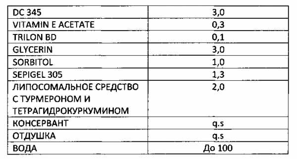 — Липосомальное наносредство, содержащее активный компонент куркумы в виде тетрагидрокуркумина (0.025%), в фосфолипидную оболочку которого дополнительно включены турмероны (TEGO турмерон, 0.1%), полученные на основе масла куркумы.