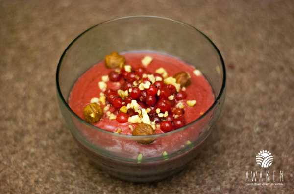 - Все ингредиенты взбиваем в блендере, посыпаем орехами, измельченной зеленью и приступаем к гармоничной трапезе.