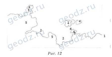 6. На рисунке 12 цифрами обозначьте: 1 — береговую линию, 2 — заливы, 3 — проливы, 4 — острова, 5 — полуострова.