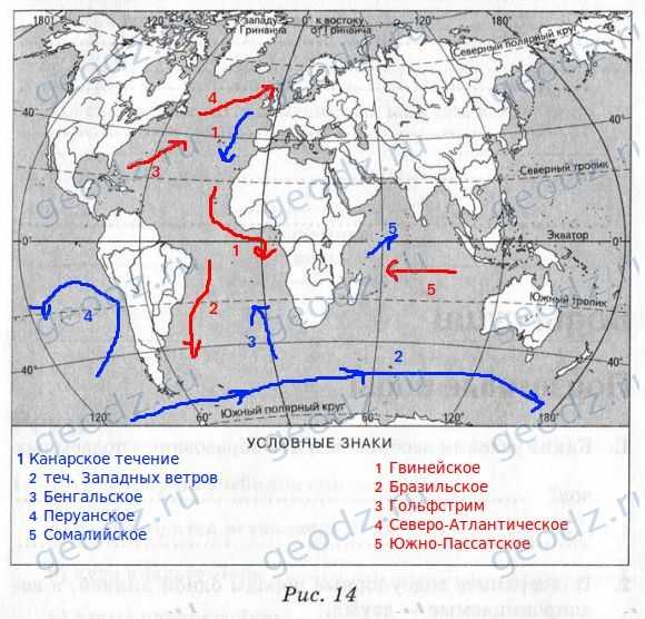 1. Пользуясь картой океанов в атласе, обозначьте на рисунке 14 пять тёплых и пять холодных течений. Подпишите их названия.