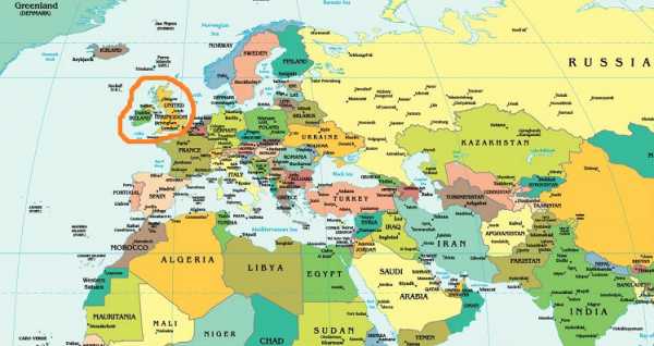 Здесь Британские острова выделены зеленым цветом: остров Великобритания — тот, что побольше, остров Ирландия — поменьше