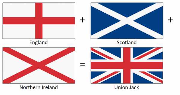 На этом рисунке видно, как из флагов Англии (крест Святого Георгия), Шотландии (крест Святого Андрея) и Северной Ирландии (крест Святого Патрика) получился британский Юнион Джек (Union Jack)