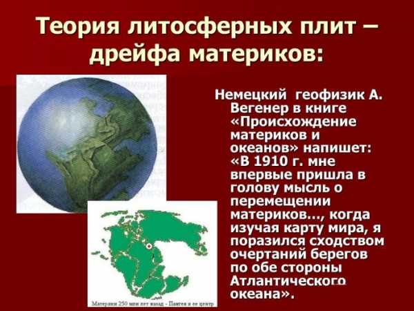 Кто же основал теорию литосферных плит? А. Вегенер одним из первых в 1920 г. сделал предположение о том, что плиты движутся горизонтально, но его не поддержали. И только в 60-х годах обследование океанического дна подтвердили его предположение.