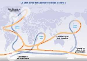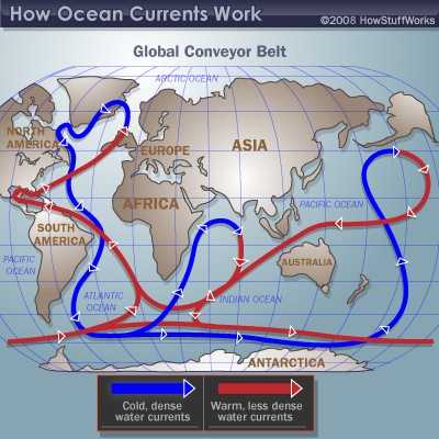 В мировом океане есть множество малых и больших течений. Они протекают вокруг континентов и встречаются вместе, создавая пять гигантских колец. Циркуляцией называют систему течений океана. Она является связующим звеном общей циркуляции атмосферы. Океанические течения поглощают и перераспределяют солнечное тепло. Теплая вода, нагретая солнцем на экваторе, переправляется в высокие широты, а холодная из полярной области течет на юг с помощью течения. Теплые течения повышают температуру воздуха, а холодные соответственно понижают. Климат на территориях с теплыми течениями влажный и теплый. Холодным и сухим климатом отличается территория, через которые проходит холодные течения.