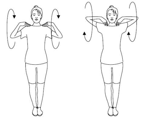 - Плечевые суставы. Делайте круговые движения руками вперед и назад по 5-10 раз.