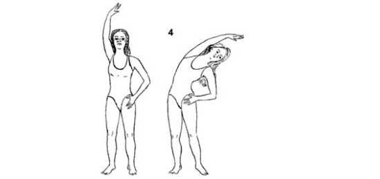 7. Растягиваем широчайшие мышцы спины. Встаньте прямо, одна рука на поясе, вторая над головой. Делайте наклоны корпусом сначала в одну сторону, потом в другую. На четыре счета по 5 повторений для каждой стороны.