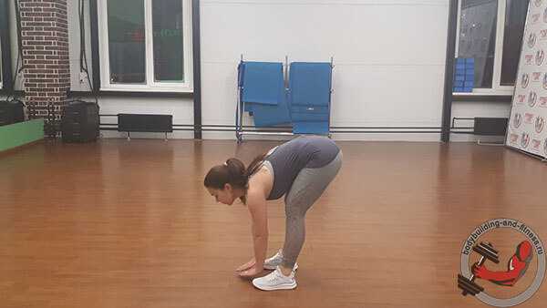 - Из положения стоя, выполните наклон корпуса к бедрам, касаясь по возможности руками пола. Не нужно делать резкие и пружинящие движения. Задержитесь в одной точке при максимальном вытяжении мышц на 10-15 секунд.