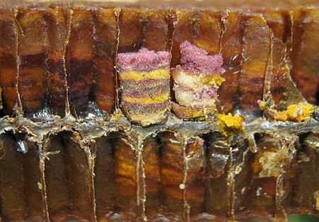 Пчелиный хлеб, вещество, которое используется пчелами для кормления младшего поколения. Пчелы собирают пыльцу с тысячи цветков, делают из нее гранулы и складывают их в соты, а сверху кладут мед. Пчеловоды всегда стараются изъять только небольшое количество этого сокровища, чтобы пчелы не остались без своей пищи.