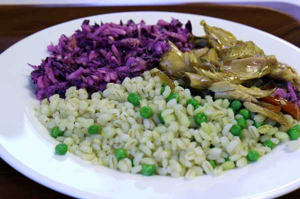 - на обед дополнить основное блюдо в виде перловки небольшим куском нежирного мяса (курица, индейка или говядина) и съесть овощной салат;