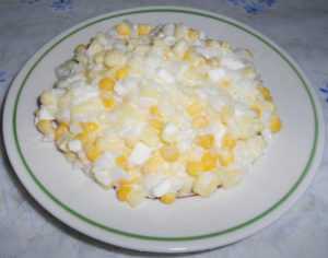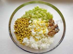Яйца отварить «вкрутую» (8-10 минут после закипания), дать остыть, начистить и нарезать кубиками.