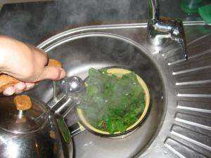 Маску из тщательно размятых листьев наносят на кожу лица, избегая области вокруг глаз.