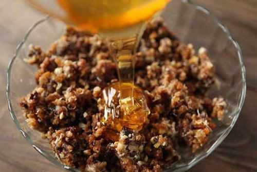 - Смешать мёд с очищенными орехами в соотношении 1:2 (орехи желательно измельчить).