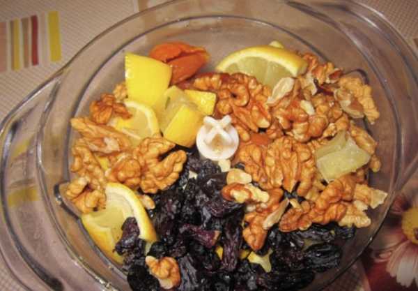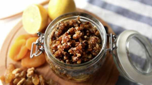 По 200 г кураги (лучше выбирать неяркую), изюма, чернослива без косточек и один лимон хорошенько вымыть, разложить на полотенце, чтобы стекла вода, а затем перемолоть на мясорубке. Столько же очищенных ядер грецкого ореха измельчить в блендере. Смешать все ингредиенты и добавить 150 г меда.