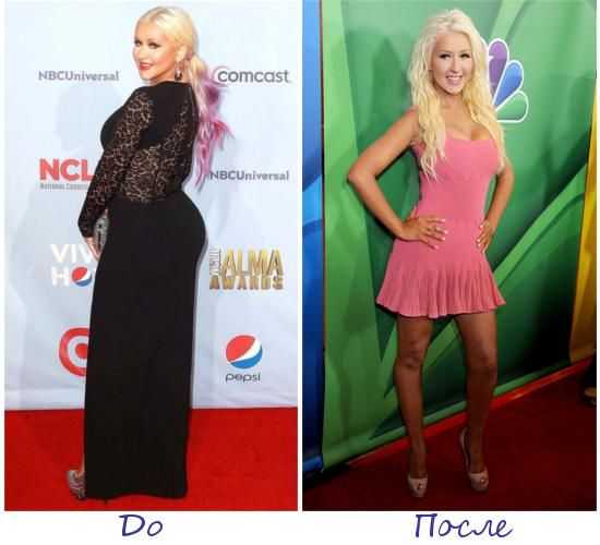 С детства Кристина была стройной и хрупкой. В течение первых 10 лет своей карьеры Агилера оставалась в форме, и даже беременность не отразилась на ее фигуре. А вот развод с мужем привел к тому, что певица набрала не один десяток килограммов и даже диеты в сочетании с физическими нагрузками не помогали ей от них избавиться. Женщина прибегала даже к гипнозу, но вес стоял на месте.
