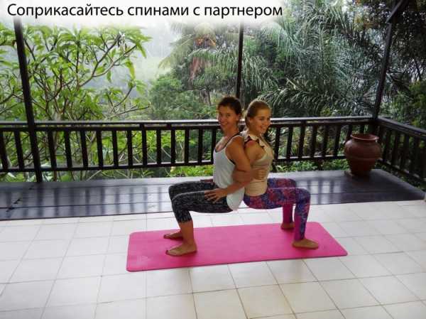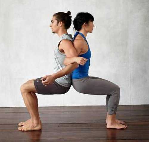 Следите за спиной и не сутультесь во время движения. Правильное положение тела при выполнении этой позы парной йоги смотрите на картинках.