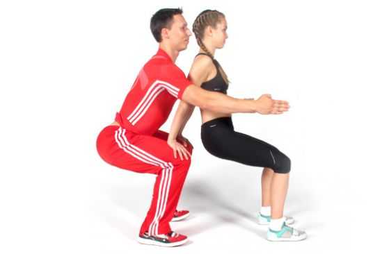 Партнеры садятся спиной друг к другу, после чего один из них помещает руки на бедра другого за его спиной.