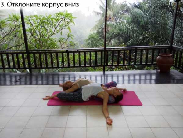 Выполняется на основе предыдущей асаны, головы партнеров при этом расположены друг к другу как можно дальше.
