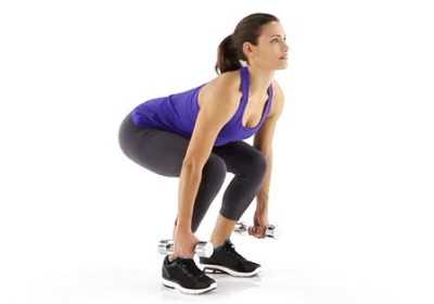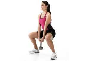 6. «Сумо» – этот вид упражнения выполняется точно также как и классический, только ноги необходимо поставить шире, а руки с гантелями держать между ног и неспешно приседать.