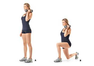 - Выпады. Штанга располагается на плечах, ее захват осуществляется ладонями вверх. Женщина делает широкий шаг вперед, сгибает колено выставленной ноги до тех пор, пока линия бедра не займет параллельное положение по отношению к полу. Задняя нога в это время сгибается в колене, но не касается пола. Выполняя упражнение, нужно чередовать ноги.