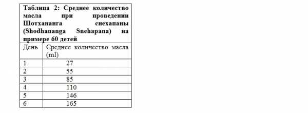 Ретроспективный анализ медицинских карт 60 детей, поступивших в отделение аюрведической педиатрии, которые прошли перед этим процедуры Панчакармы в SDM College of Ayurveda and hospital, преимущественно выявили проблемы со вкусом, запахом и соответствием требованиям, предъявляемым в процессе лечения. В таблице 5 дана информация о том, с какими конкретными категориями диагнозов в период с января 2015 года по апрель 2015 года имели дело врачи при проведении процедуры внутреннего промасливания (Шотхананга снехапана) детей с целью их дальнейшего лечения методами Панчакармы.