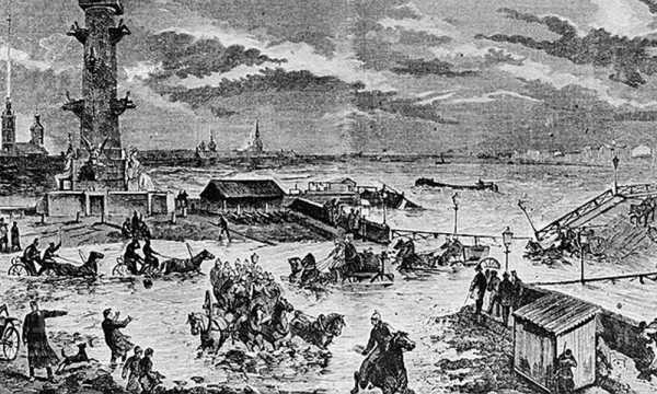 Произошло оно в ноябре 1824г. Одно из самых страшных за всю историю Петербурга. Накануне с залива дул ледяной пронизывающий ветер, позже начался дождь, хотя такой погодой петербуржцев не напугаешь. К вечеру уровень воды в каналах резко поднялся, а затем весь город оказался затопленным. Вода в Неве была выше четырёх метров. Итогом этого стихийного бедствия стала гибель около шестисот людей, много народу пропало без вести – их тела воды унесли в Финский залив, разрушены 462 дома, повреждены около четырёх тысяч зданий. Общий ущерб был нанесён по тем временам колоссальный – около двадцати миллионов долларов. Таких наводнений в Петербурге было очень много, более трёхсот. На знаниях установлены надписи, где отмечен уровень воды в 1824 году.