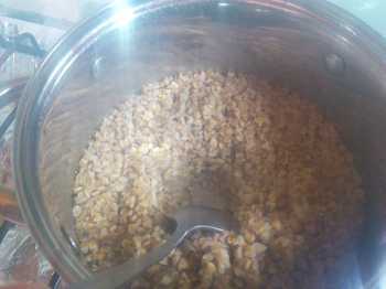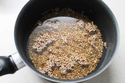 - Гречка заливается водой и доводится до кипения. Далее под крышкой на минимальном огне она оставляется до полного выкипания воды.