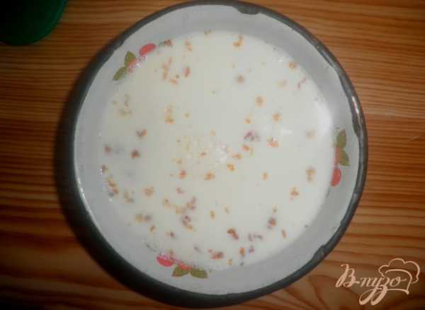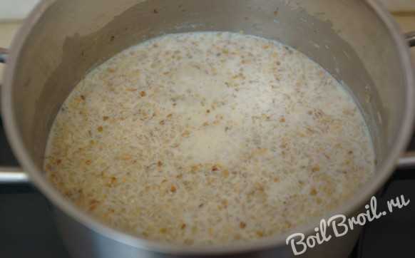 - Далее уже слегка разваренная крупа заливается молоком. Оно не должно быть холодным.