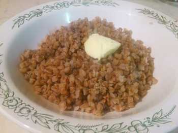 - Далее в гречу выкладывается масло. Масса солится, подслащивается по вкусу или приправляется медом.