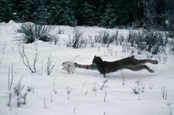 У рысей небольшое сердце- она не может энергично и долго бегать (вон и 3х минут не выдержала). Ее манера — один точный прыжок на спину- напасть из засады или с дерева над тропой, где она может терпеливо и долго дожидаться свою жертву. Охотится рысь обычно ночью, днем же предпочитает отдыхать. А заяц попался матерый, опытный , хладнокровный — чуть настигает — прыг в снег и сбил с толку. ))
