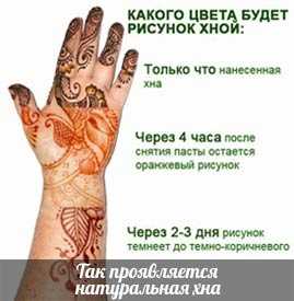 И не натуральная хна, это только теоретически называется хной, на самом деле это краска с содержанием хны. Всё же основной красящий элемент — это специальная краска для кожи. Но среди мастеров так же принято называть это хной всё что в тюбиках и в конусах. В этой краске содержится хна, поэтому чёрная краска может ещё отдавать коричневым цветом, когда сходит рисунок. Рисунки хной-краской держатся около 5 дней. Если уж очень аккуратно относиться к рисунку, то можно добиться сохранения рисунка до 7 дней.