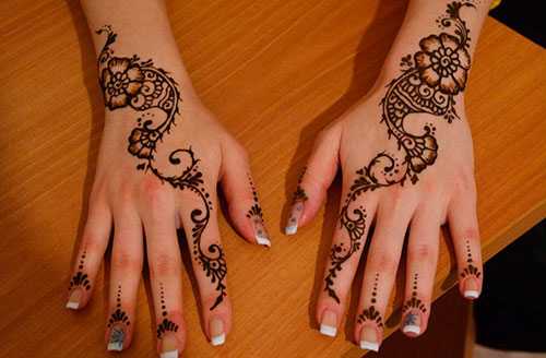Практика показывает, чем грубее кожа, тем выразительнее рисунок. Мастера менди советуют выбирать для росписи ладони и стопы. Но на руке изображение хной будет чуть менее насыщенным из-за постоянного контакта с водой. Верхний яркий слой сойдет, а вот основная часть останется и будет служить длительное время. На внутренней стороне локтей и коленей получаются самые блеклые и невзрачные эскизы. Спина и живот – удачные места для украшения, но татуировка быстро теряет четкость контуров. Сколько сможет продержаться мехенди на руках? В среднем срок составляет 2-3 недели.