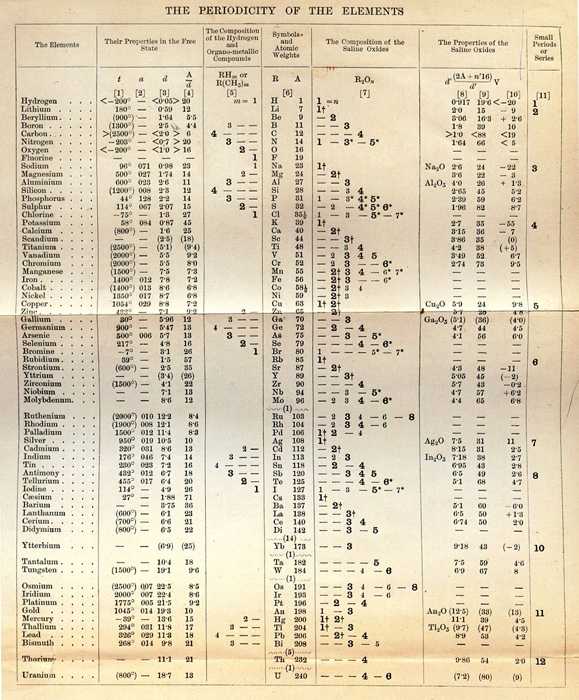 Через пять лет после Мейера, в 1969 году Менделеев опубликовал доклад, в котором сообщил об открытии им зависимости между атомными весами элементов и их химическими свойствами. В том же году он опубликовал «Основы химии», в которых был приведен первый вариант его таблицы, содержащей 19 горизонтальных рядов и 6 вертикальных. Таблица Менделеева весьма значительно отличались от той, которую Вы видели на уроках химии. На то время было известно только 63 элемента, из которых один — дидим — оказался смесью празеодима и неодима.
