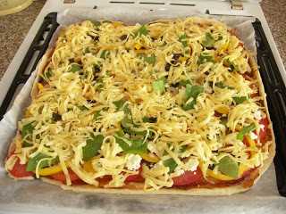 На тесто для пиццы нанести томатный соус, распределить овощи. Размятый сыр равномерно посыпать поверх овощей и сбрызнуть оливковым маслом.