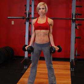 - Встаньте прямо. В каждую руку возьмите по гантели. Ручка гантели и ладонь должны быть направлены к телу.