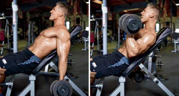 Сгибание рук с гантелями на бицепс в наклонной скамье