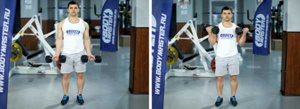 По правильной технике исполнения. Исходная позиция – широко расставленные ноги и выпрямленная спина, гантели взяты в руки обратным хватом. Локти в неизменном положении, на протяжении всего упражнения, прижаты к бокам. Подъём гантелей происходит не до самой верхней точки амплитуды: в ней рабочая нагрузка уже переместится с бицепсов на передние дельтовидные мускулы.