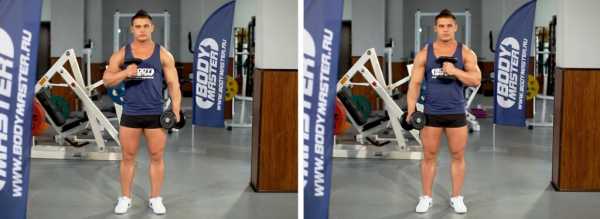 Сгибание рук с гантелями на бицепс стоя также можно выполнять либо сразу двумя руками, либо поочередно: